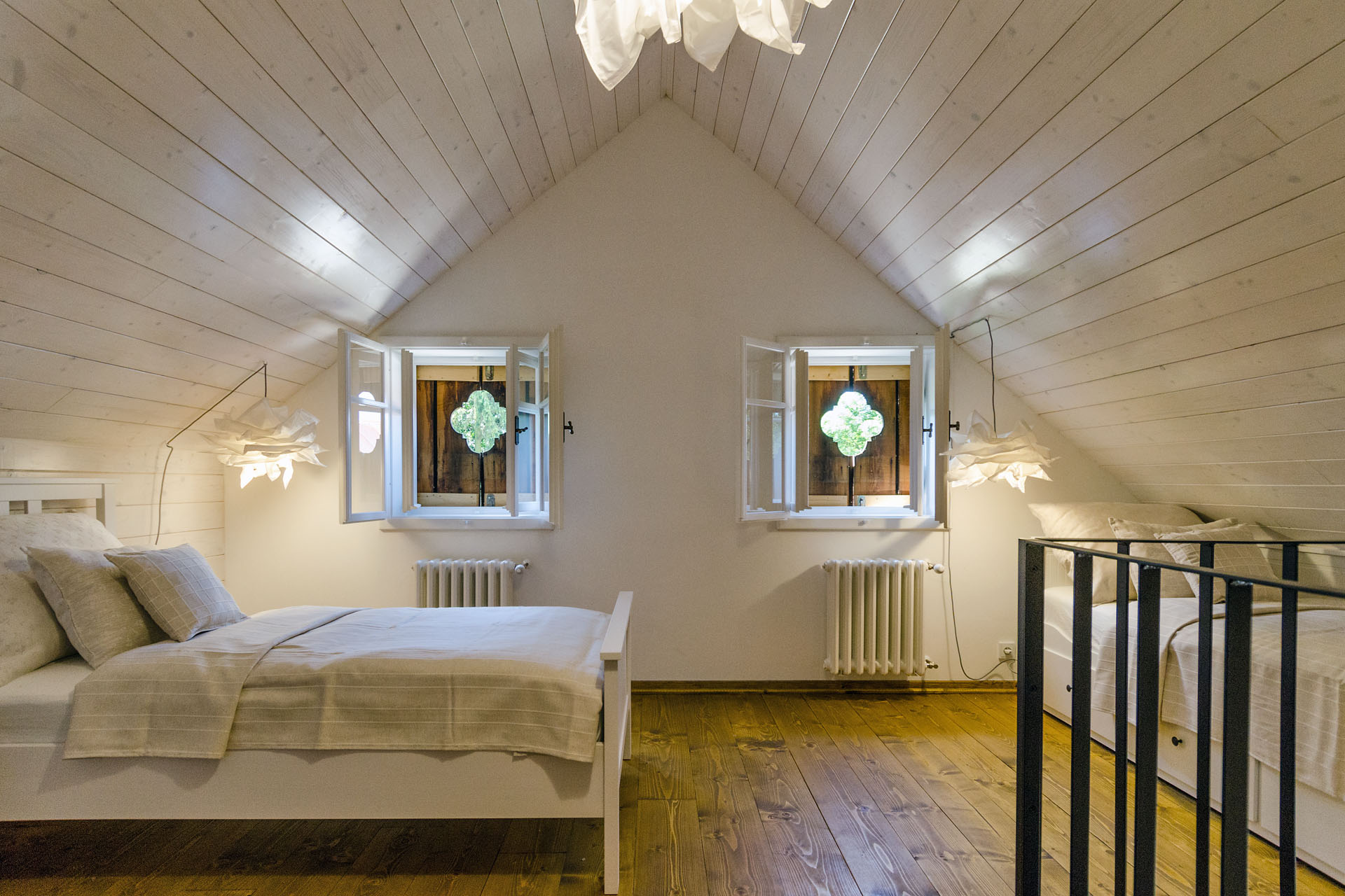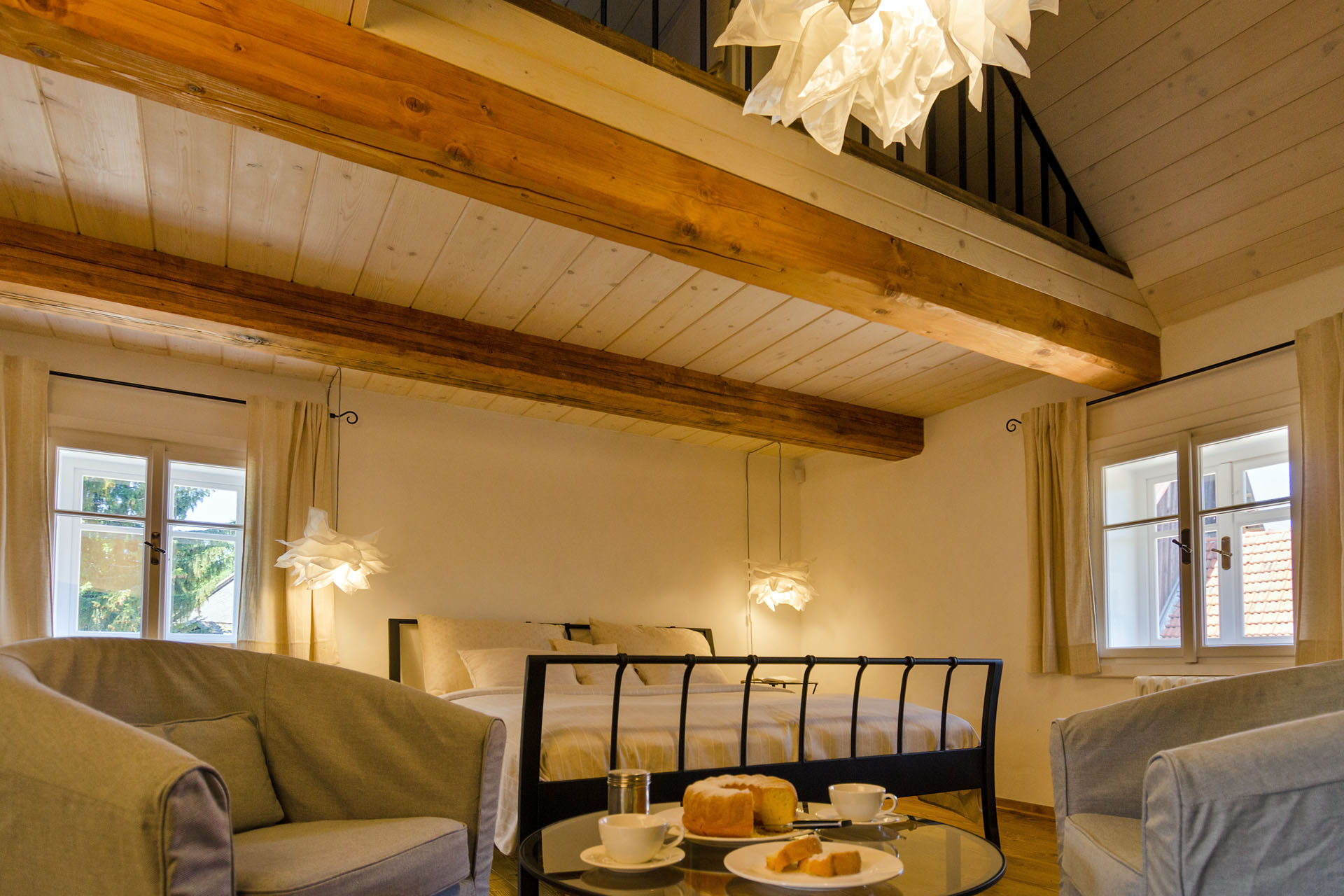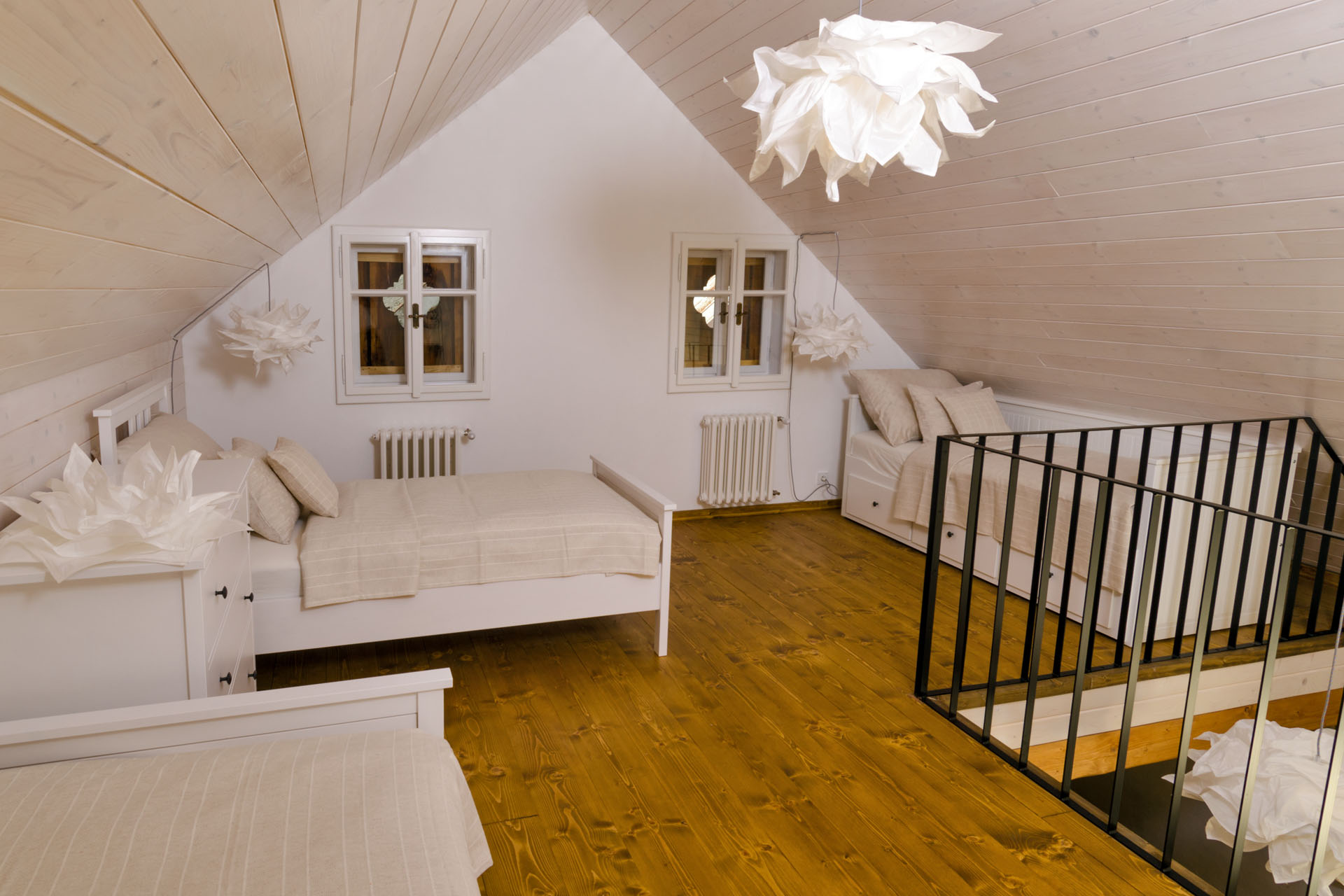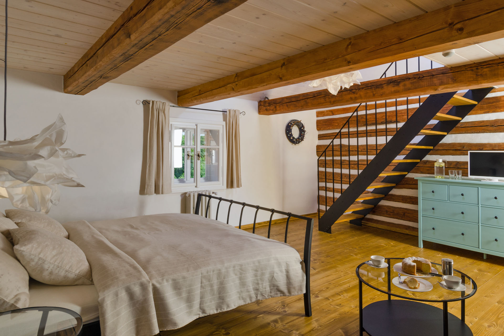 Prostorný mezonetový pokoj s 1 manželskou postelí v přízemí (matrace š. 2 × 90 cm, d. 200 cm), v patře s 1 manželskou postelí (matrace š. 2 × 80 cm, d. 200 cm) a 2 jednolůžky (matrace š. 80 cm, d. 200 cm). Do pokoje se z pavlače vchází přes předsíň se vstupem na samostatnou toaletu. Z ložnice v přízemí vstoupíte do koupelny se sprchovým koutem. Výhled do zahrady. V pokoji je TV.