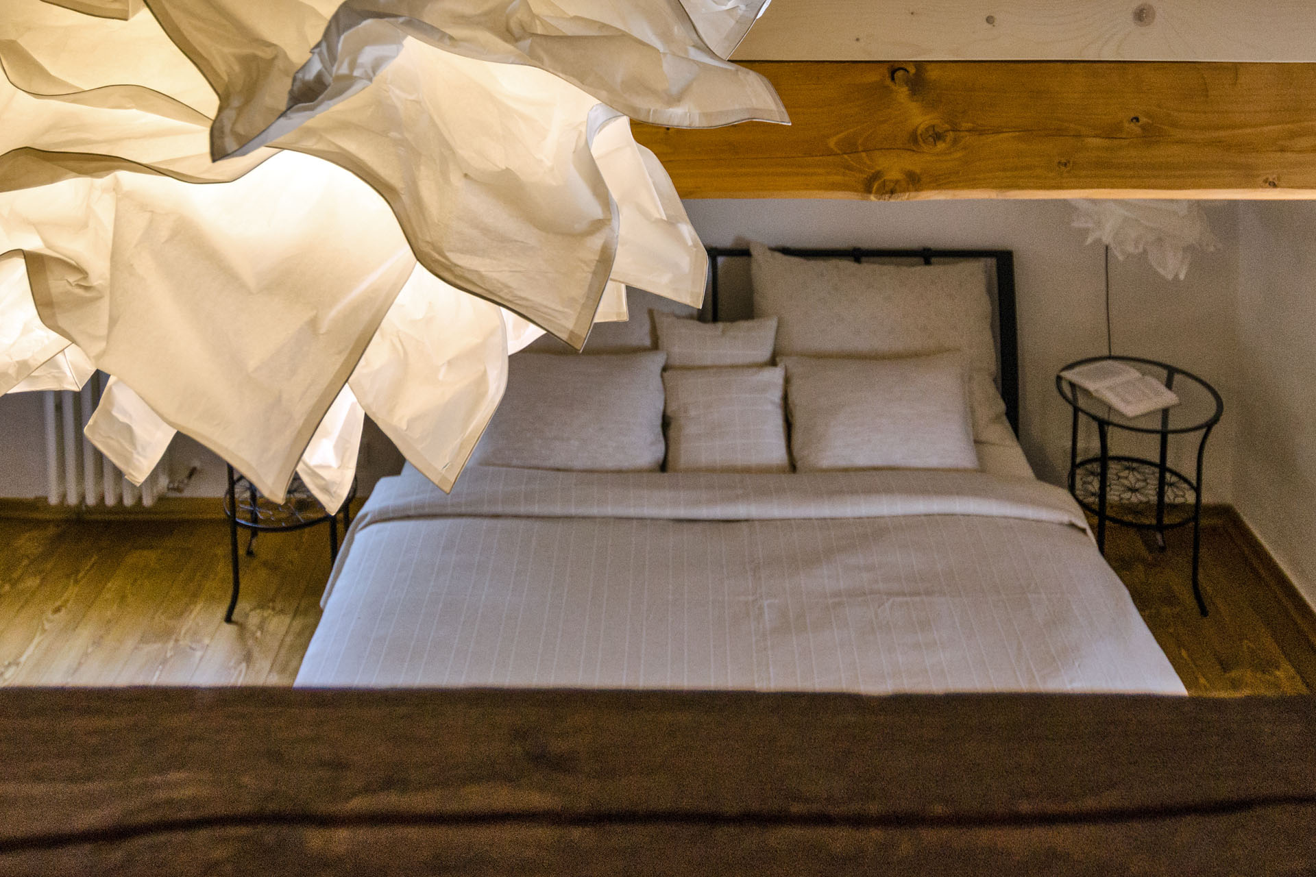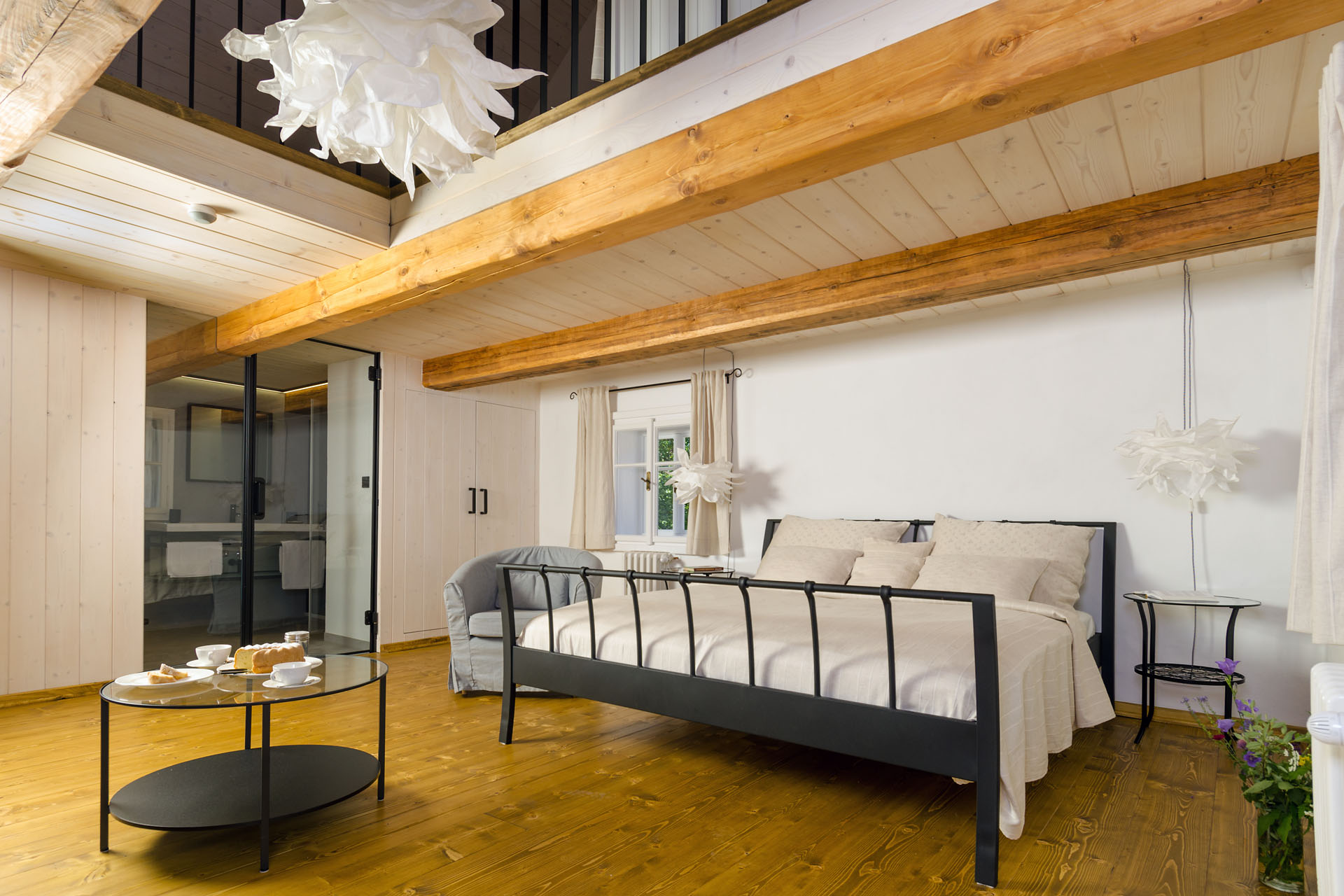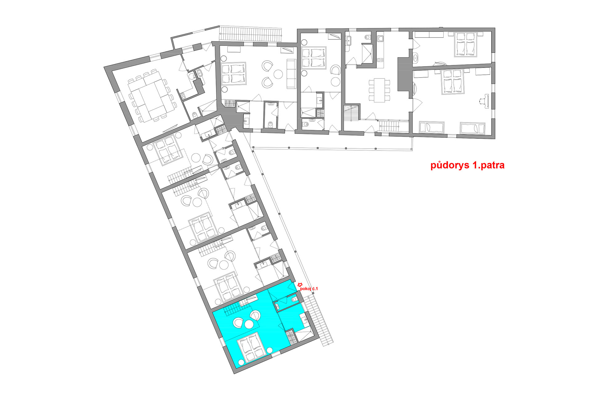 Prostorný mezonetový pokoj s 1 manželskou postelí v přízemí (matrace š. 2 × 90 cm, d. 200 cm), v patře s 1 manželskou postelí (matrace š. 2 × 80 cm, d. 200 cm) a 2 jednolůžky (matrace š. 80 cm, d. 200 cm). Do pokoje se z pavlače vchází přes předsíň se vstupem na samostatnou toaletu. Z ložnice v přízemí vstoupíte do koupelny se sprchovým koutem. Výhled do zahrady. V pokoji je TV.