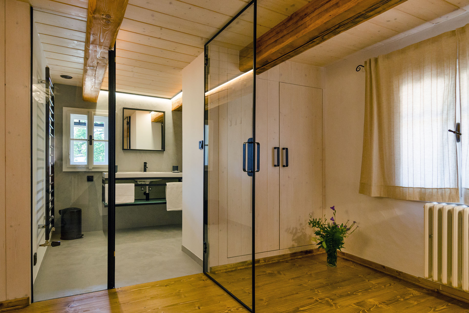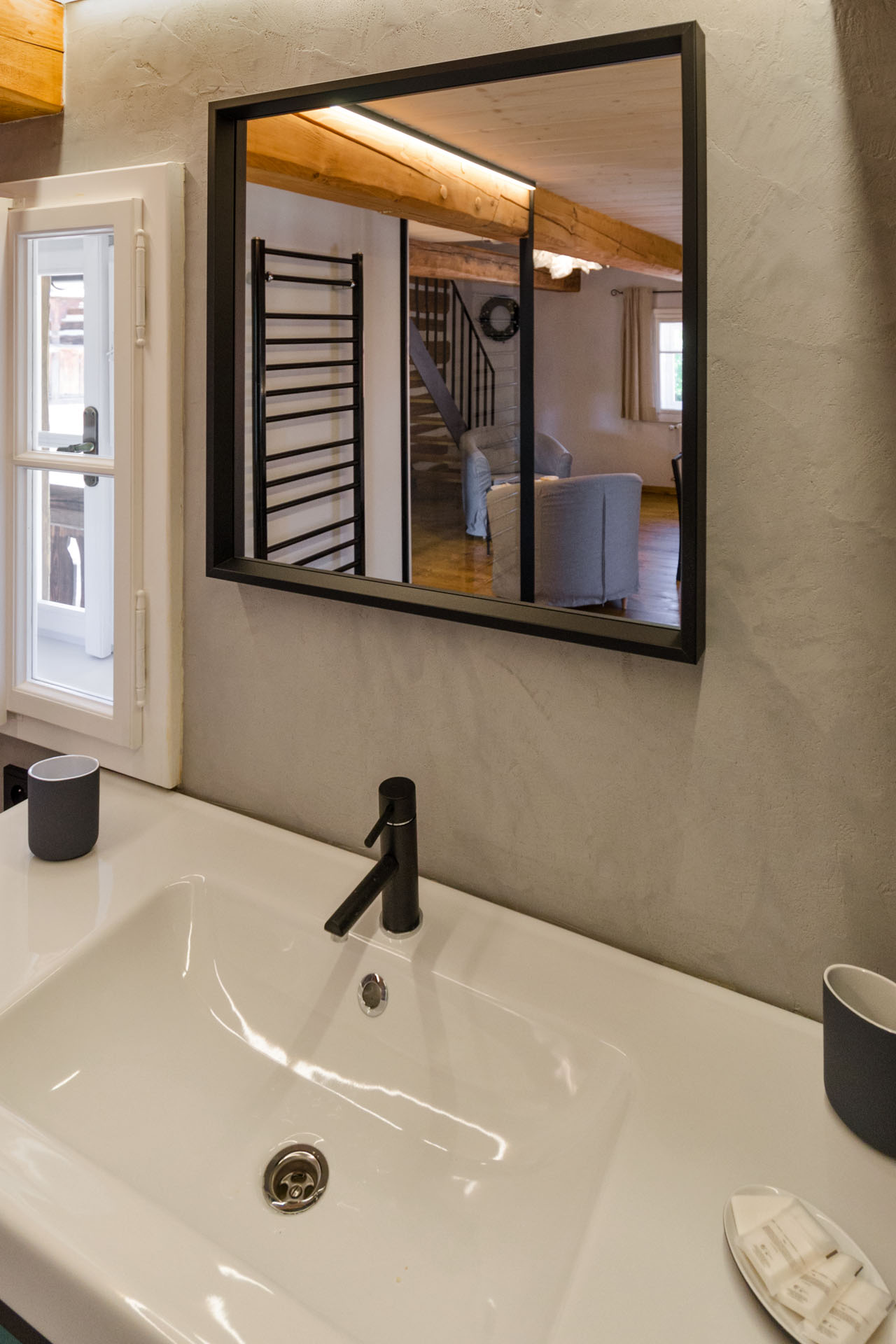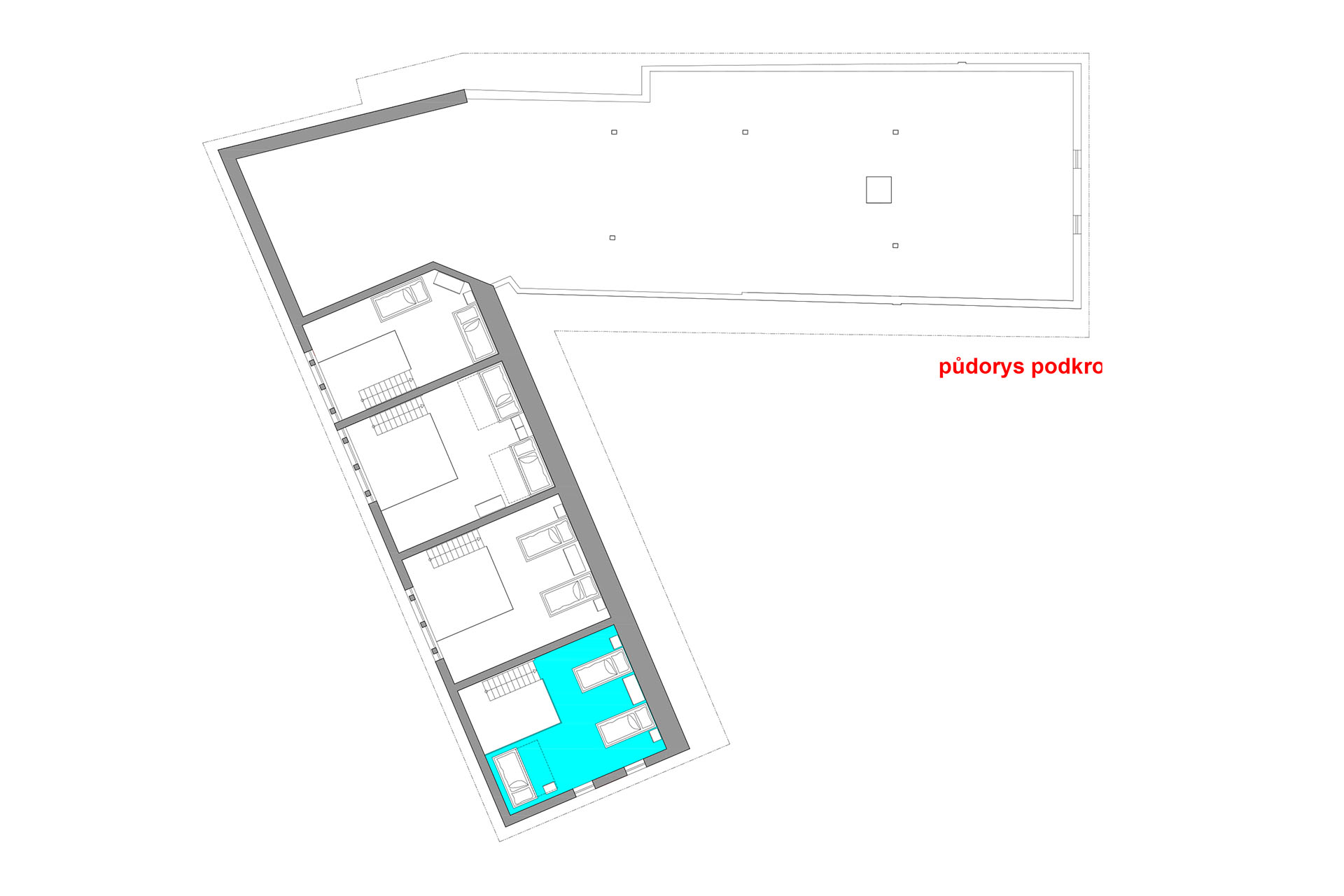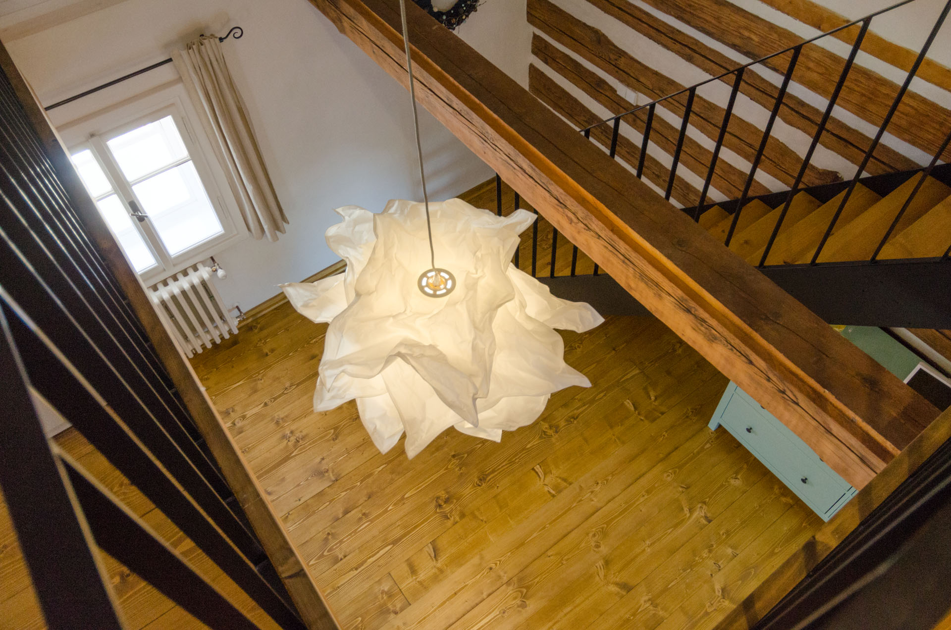 Prostorný mezonetový pokoj s 1 manželskou postelí v přízemí (matrace š. 2 × 90 cm, d. 200 cm), v patře s 1 manželskou postelí (matrace š. 2 × 80 cm, d. 200 cm) a 2 jednolůžky (matrace š. 80 cm, d. 200 cm). Do pokoje se z pavlače vchází přes předsíň se vstupem na samostatnou toaletu. Z ložnice v přízemí vstoupíte do koupelny se sprchovým koutem. Výhled do zahrady. V pokoji je TV.